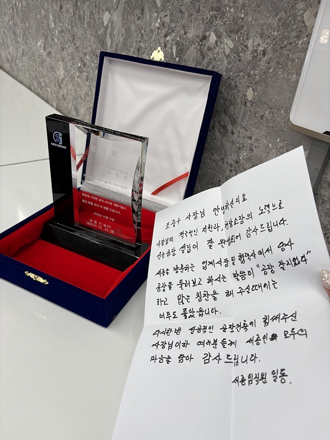 ▲ 세종기술(주) 감사패 및 자필편지 전달